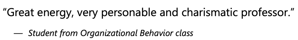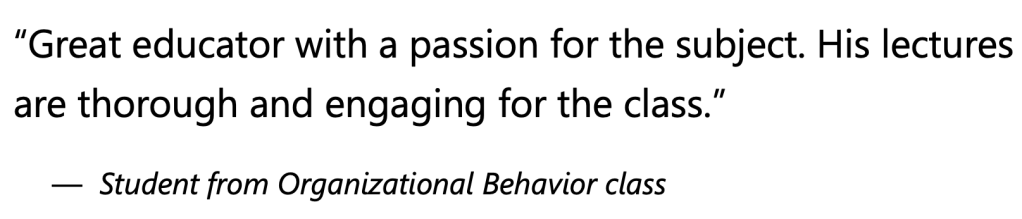 The dynamic nature of today’s educational landscape, especially with the integration of AI and other technologies, necessitates an adaptive teaching approach. I continually update my course content and teaching strategies to reflect the latest developments in the field. For instance, I integrate discussions on the impact of AI on organizational behavior and job security, helping students understand and navigate the complexities of the modern workplace. I also utilize various teaching technologies to enhance learning, such as online discussion boards and virtual office hours.
